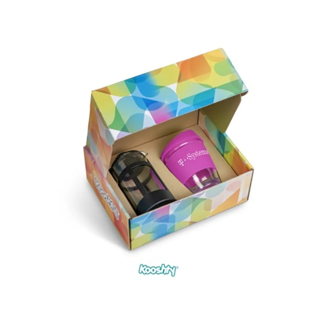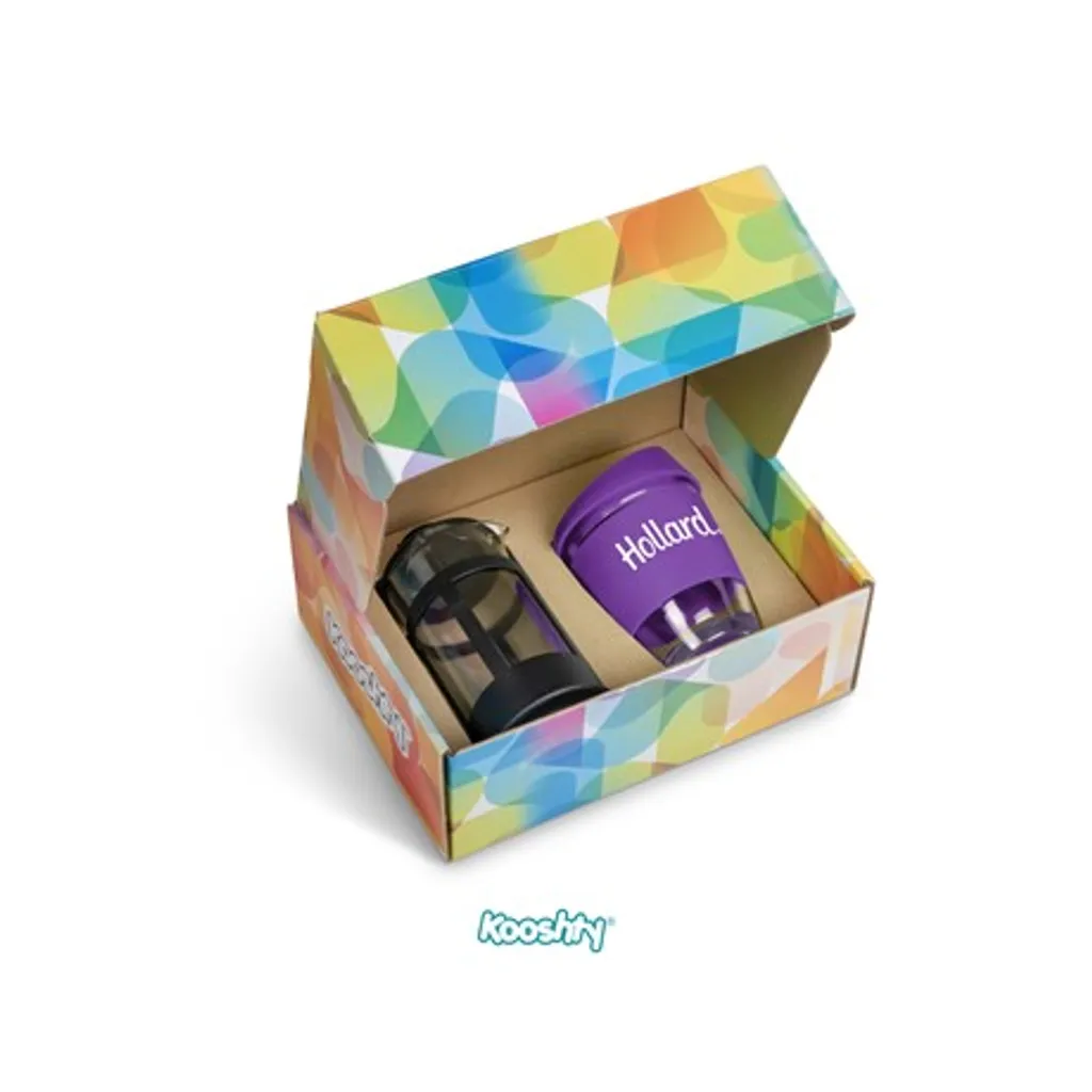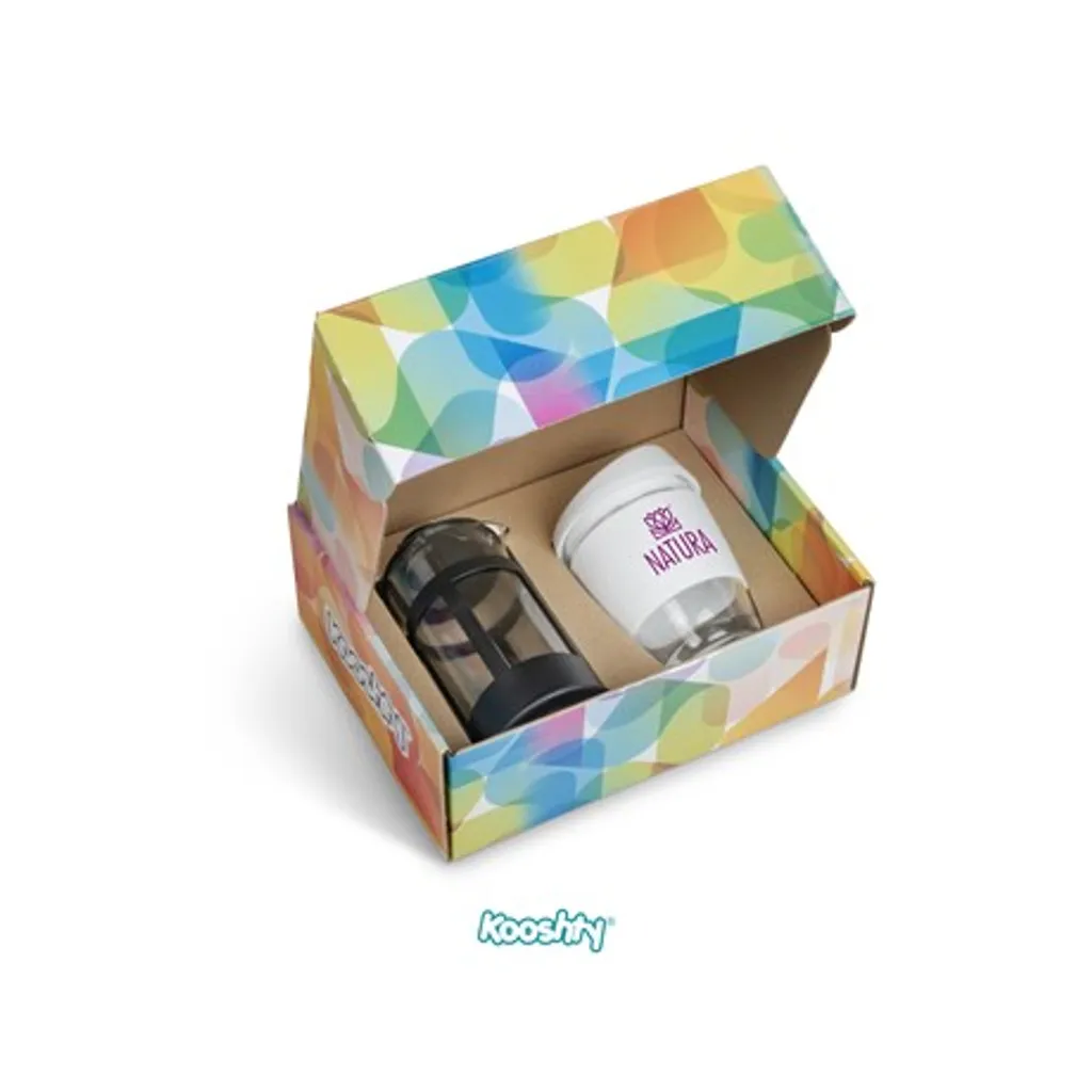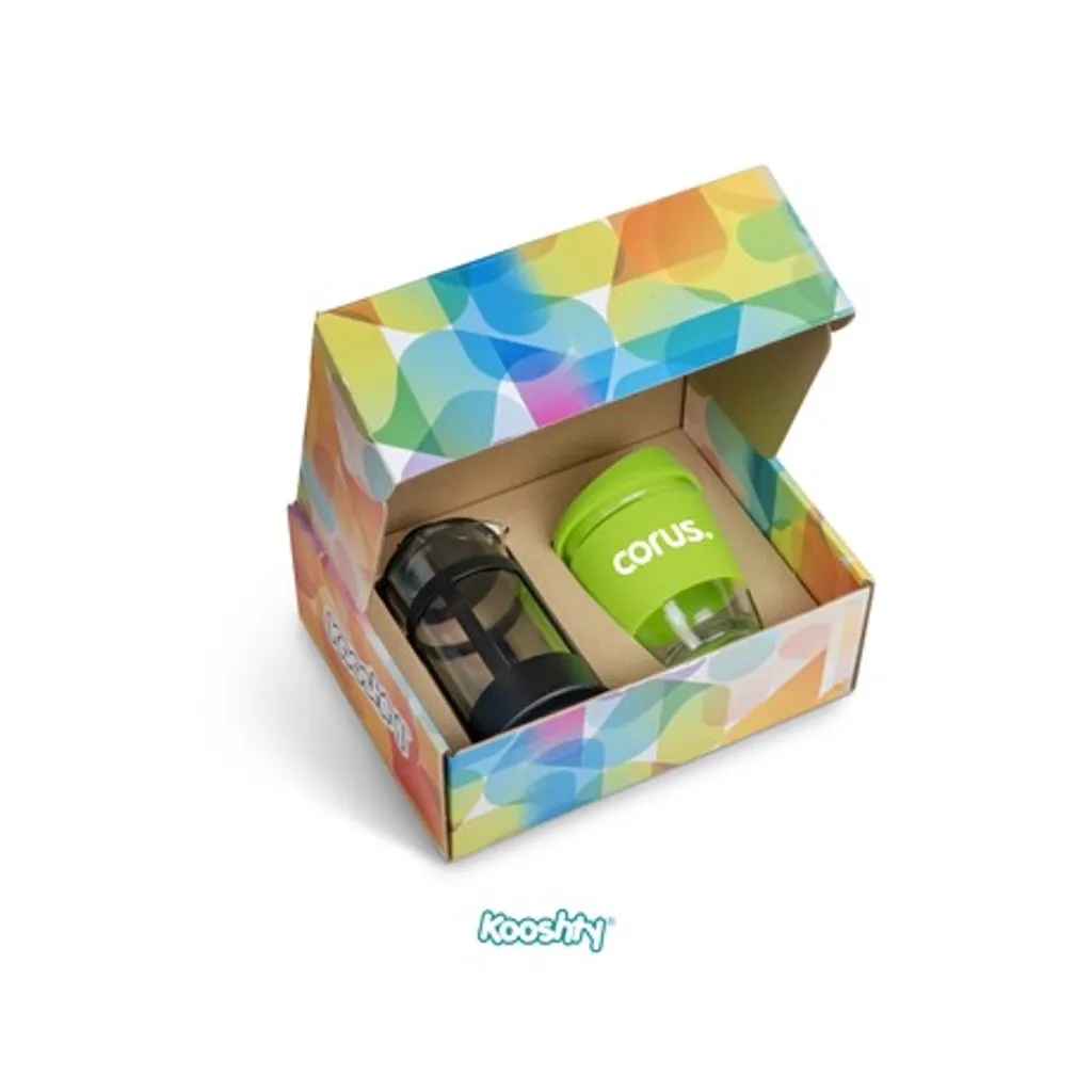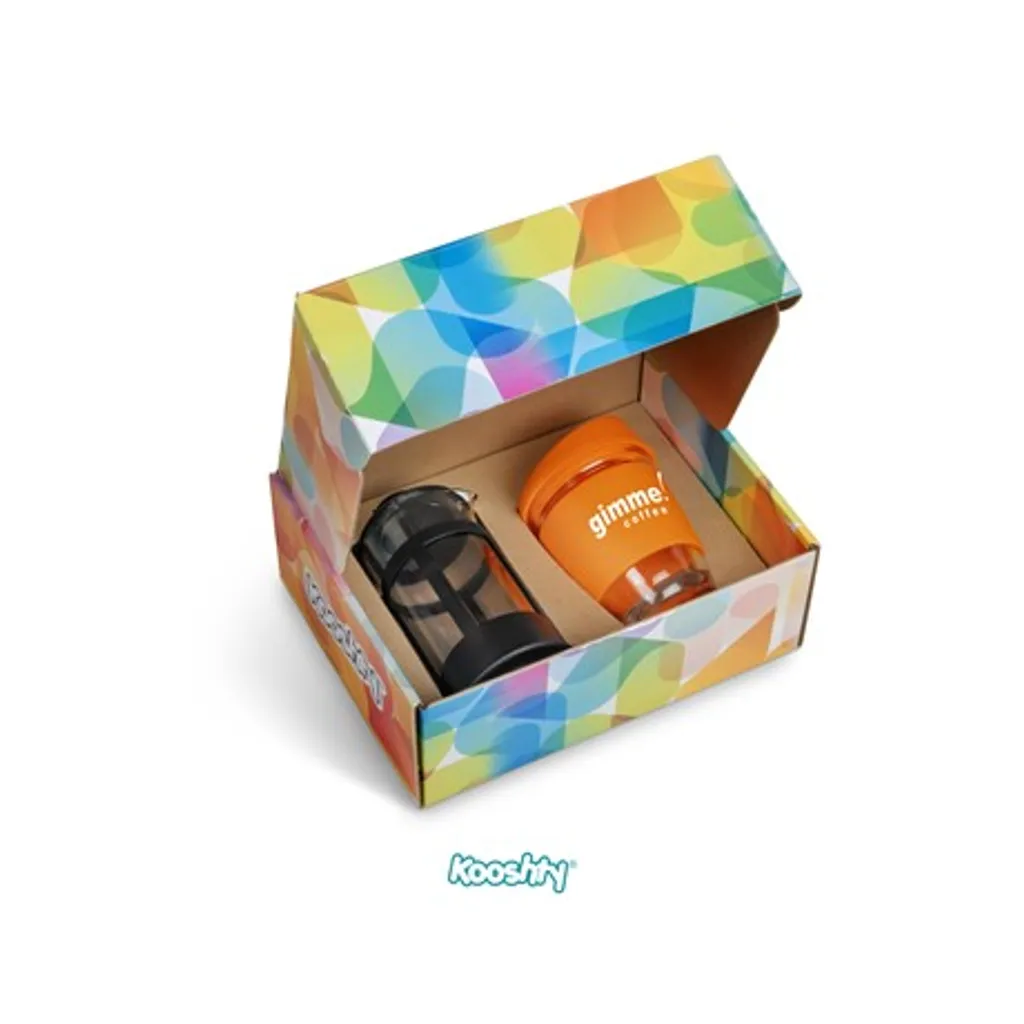 Kooshty Kup: borosilicate glass with silicone grip band and lid340ml plunger: borosilicate glass350ml presentation box: 24.5 ( l ) x 19 ( w ) x 9.5 ( h ) Save money and save the planet by making yourself a cup of coffee with your Kooshty plunger and drinking it from the reusable Kooshty Kup. The Kooshty Kup Original, with its colourful silicone lid and grip band, is a fun and practical glass cup for the home or the office, and is ideal for coffee on the go, fitting comfortably inside your vehicle’s cup holder. The ergonomically designed, splash-safe silicone lid provides for a pleasant sipping experience. The funky silicone band keeps your drink warmer and protects your hands from the heat of the liquid inside the cup. Made from strong borosilicate glass, the Kooshty Kup is an eco-friendly alternative to the plastic-lined single use cups used by most coffee shops for takeaways. The Kooshty Kup cup is dishwasher and microwave friendly. This set contains a 350ml borosilicate glass coffee plunger and a 340ml Kooshty Kup, packaged in a refreshingly bright and cheerful gift box. Wash care Wash before first use Dishwasher safe, top shelf only Microwave safe Caution Use with care when consuming hot beverages Do not overfill Ensure lid is secure before drinking Do not hold glass filled with hot liquid without the silicone sleeve Do not use glassware that is chipped or cracked