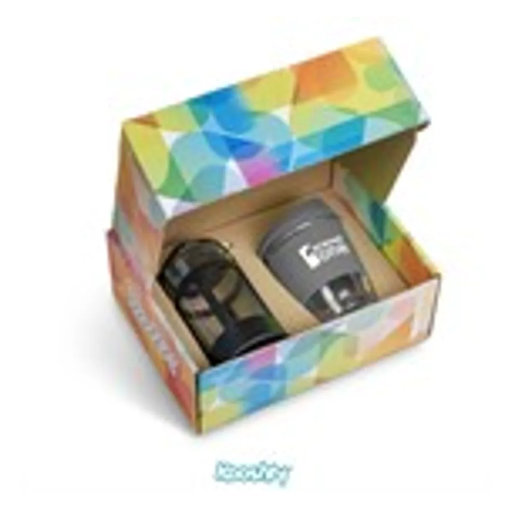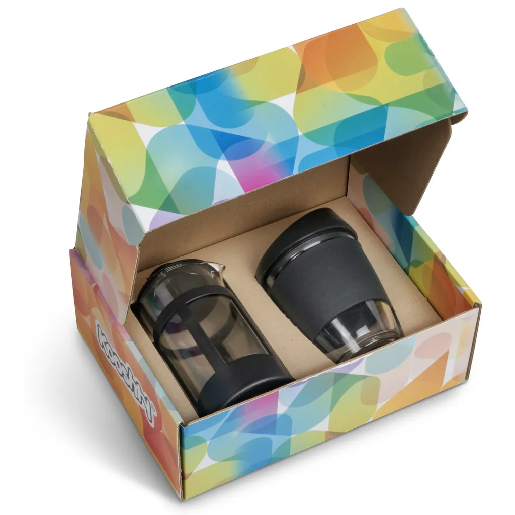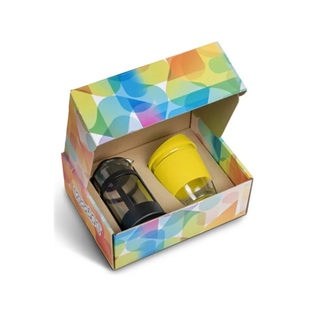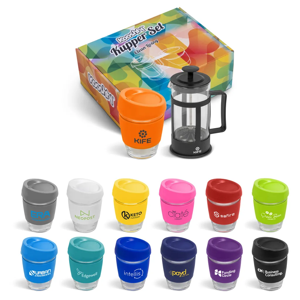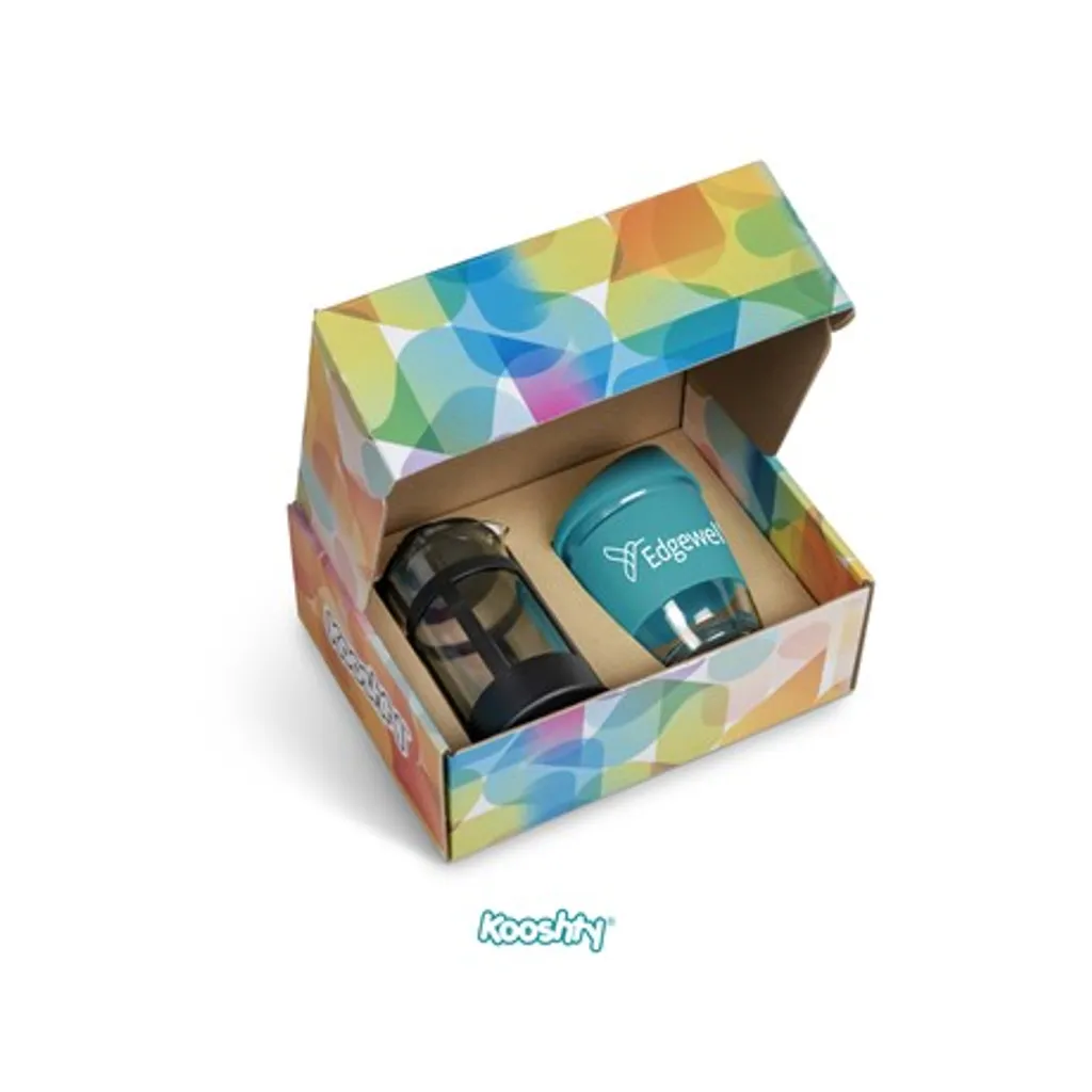 Kooshty Kup: borosilicate glass with silicone grip band and lid340ml plunger: borosilicate glass350ml presentation box: 24.5 ( l ) x 19 ( w ) x 9.5 ( h ) Save money and save the planet by making yourself a cup of coffee with your Kooshty plunger and drinking it from the reusable Kooshty Kup. The Kooshty Kup Original, with its colourful silicone lid and grip band, is a fun and practical glass cup for the home or the office, and is ideal for coffee on the go, fitting comfortably inside your vehicle’s cup holder. The ergonomically designed, splash-safe silicone lid provides for a pleasant sipping experience. The funky silicone band keeps your drink warmer and protects your hands from the heat of the liquid inside the cup. Made from strong borosilicate glass, the Kooshty Kup is an eco-friendly alternative to the plastic-lined single use cups used by most coffee shops for takeaways. The Kooshty Kup cup is dishwasher and microwave friendly. This set contains a 350ml borosilicate glass coffee plunger and a 340ml Kooshty Kup, packaged in a refreshingly bright and cheerful gift box. Wash care Wash before first use Dishwasher safe, top shelf only Microwave safe Caution Use with care when consuming hot beverages Do not overfill Ensure lid is secure before drinking Do not hold glass filled with hot liquid without the silicone sleeve Do not use glassware that is chipped or cracked